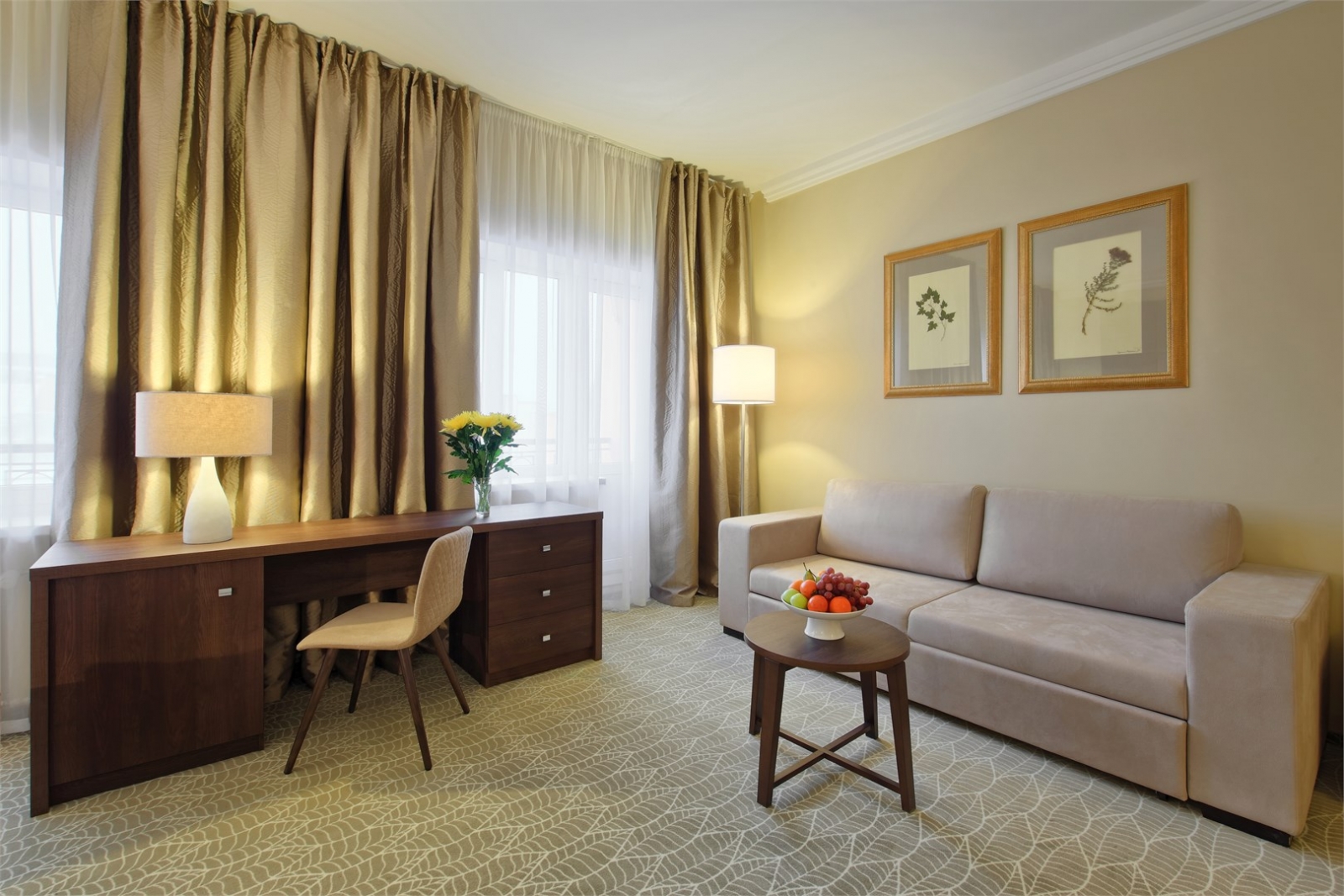 Площадь номера - 41 кв.м. 2 осн. места. 1 доп. место. Мебель: вешалка, диван, кровать двуспальная, прикроватные тумбочки, стол, столик журнальный, стул, шкаф. Оборудование: кондиционер, сейф, телевизор, телефон, чайный набор посуды, электрочайник. Санузел: с душем, туалетные принадлежности, фен. Сервис: Wi-Fi бесплатно, смена полотенец, смена постельного белья, уборка номера.