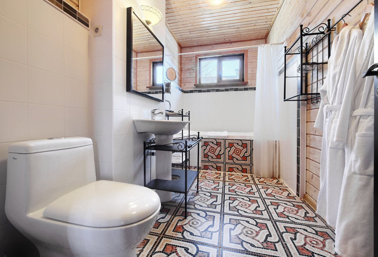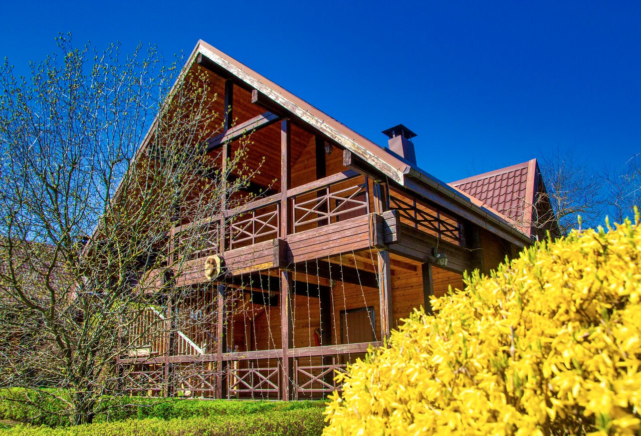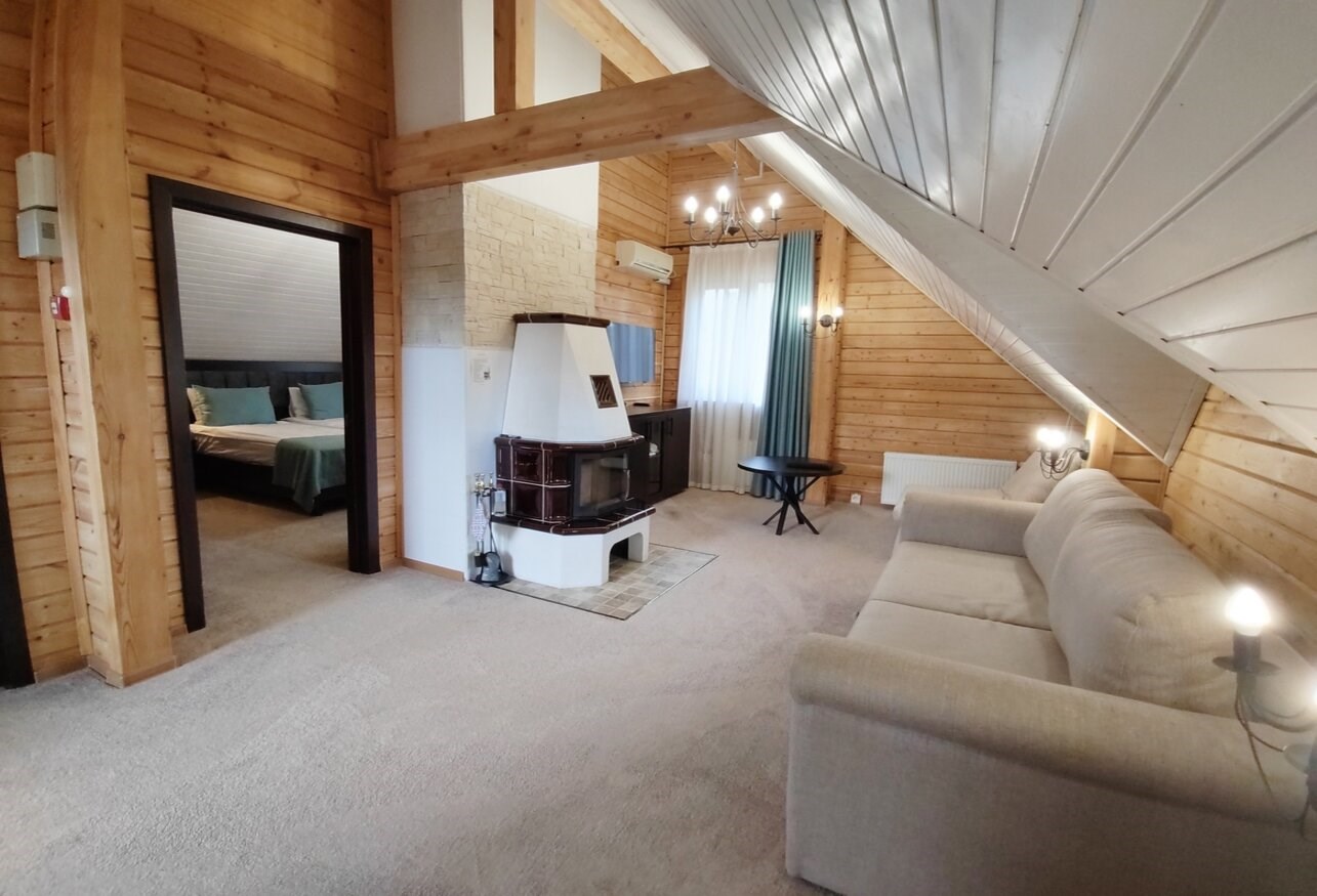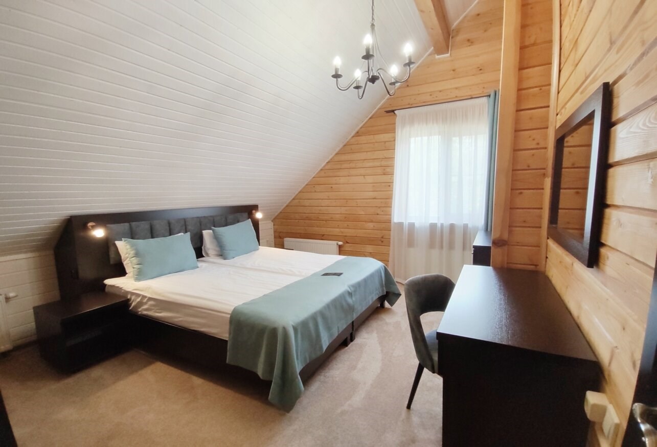 Площадь каждого этажа с верандой 60 м2. На выбор гостя предоставляются номера с двумя кроватями (1 х 2м) или одной большой кроватью (2 х 2м). При бронирования номера от 3-х ночей - входит одно посещение СПА-комплекса «Итальянские термы» (кроме Пт., Сб., Вс.). Питание в ресторане по системе "Шведский стол". Вдоль асфальтированных дорожек уютно разместились двухэтажные коттеджи, утопающие в зелени верхнего парка. Все 16 номеров в коттеджах имеют уникальный дизайн, ни один интерьер номера в коттедже не повторяет другой. В коттедже два номера с отдельным входом, состоящих из гостиной, спальни и ванной комнаты. Камин в гостиной добавляет уют и немного романтики во время отдыха. На веранде находится деревянная мебель для отдыха.
